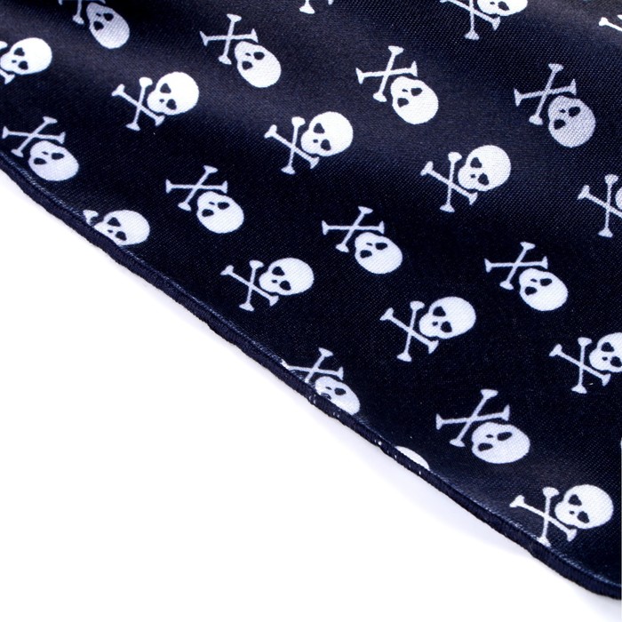 - Бандана с черепами — яркий акцент костюма. Изготовлена из качественного материала, она подходит для мужчин и женщин. Легко завязывается и удобна в использовании.