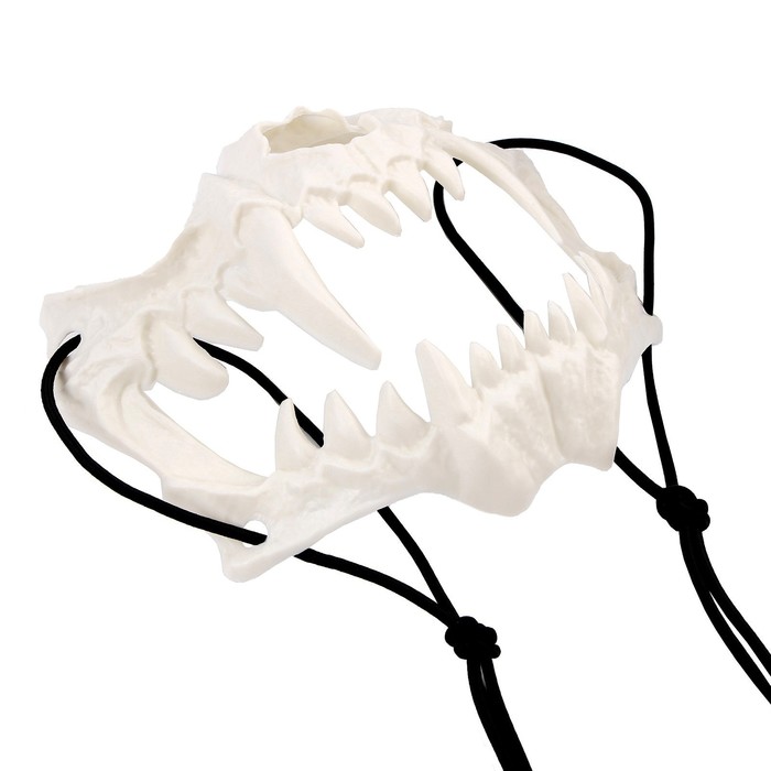 - Маска в виде челюсти придаёт образу загадочности. Выполнена из прочного и легкого материала. Она прикрепляется ко рту при помощи резинок, которые нужно зацепить за уши.
