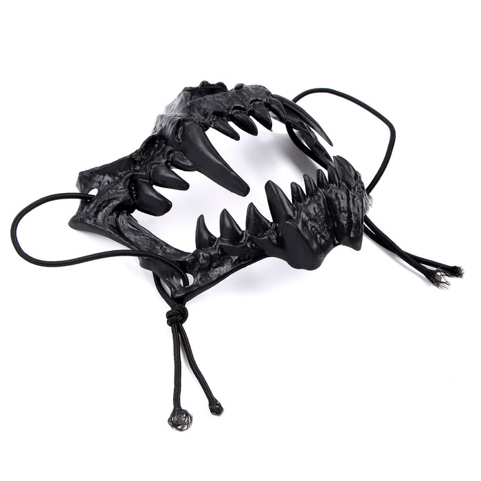 • Маска в виде челюсти придаёт образу загадочности. Выполнена из прочного и легкого материала. Она прикрепляется ко рту при помощи резинок, которые нужно зацепить за уши.
