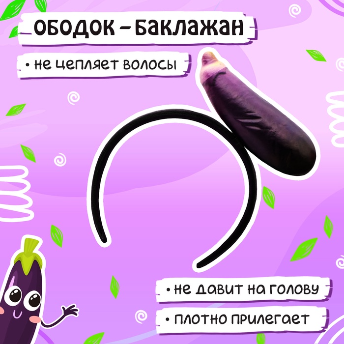 - Ободок. Стильный и мягкий ободок с объёмным изображением баклажана станет завершающим штрихом костюма. Яркий и красочный, он привлечёт внимание всех окружающих.