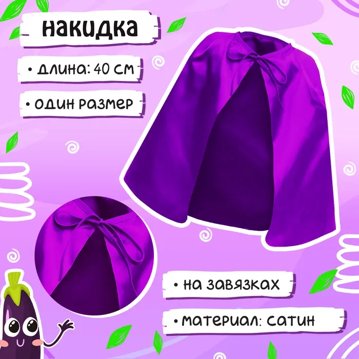 - Накидка. Мягкая и приятная на ощупь накидка из полиэстера фиолетового цвета длинной 40 см. Она легко надевается и фиксируется на шее с помощью завязок. Она создаёт образ спелого баклажана и добавляет образу юного огородника яркости и поднимает настроение.
