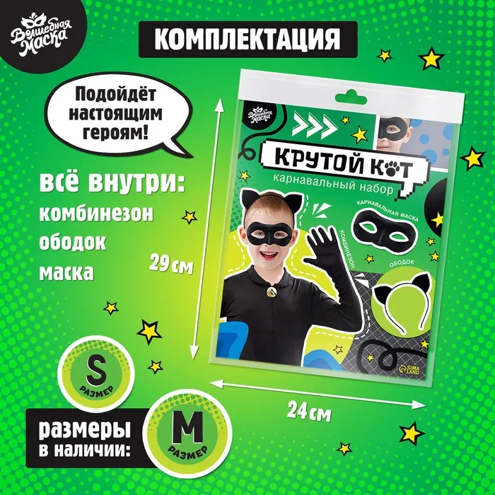 С набором «Крутой кот» ваш малыш станет настоящей звездой на детской вечеринке и поразит всех гостей! С ним вы составите полноценный образ, ведь в комплекте есть комбинезон, маска и ободок. Создавайте яркие эмоции и воспоминания на целый год вперёд себе и ребёнку!