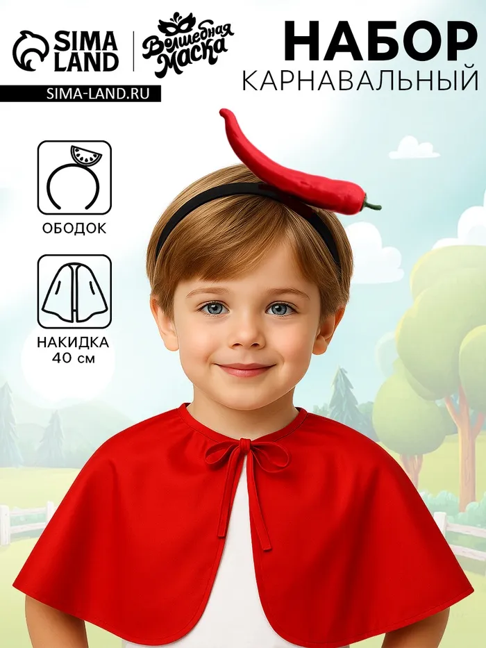 Карнавальный набор «Крутой перец» превратит вашего ребёнка в самого необычного гостя на любом осеннем празднике. Набор состоит из двух основных элементов: накидки и ободка.