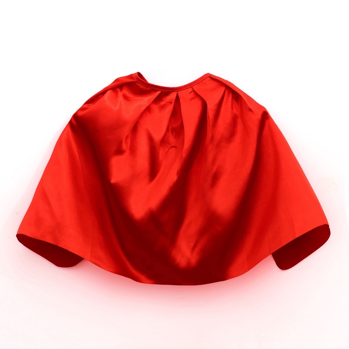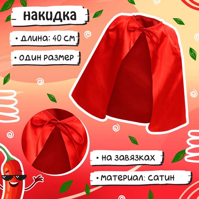 - Накидка. Мягкая и приятная на ощупь накидка из полиэстера красного цвета длинной 40 см. Она легко надевается и фиксируется на шее с помощью завязок. Она создаёт образ перчика и добавляет образу юного огородника яркости и поднимает настроение.