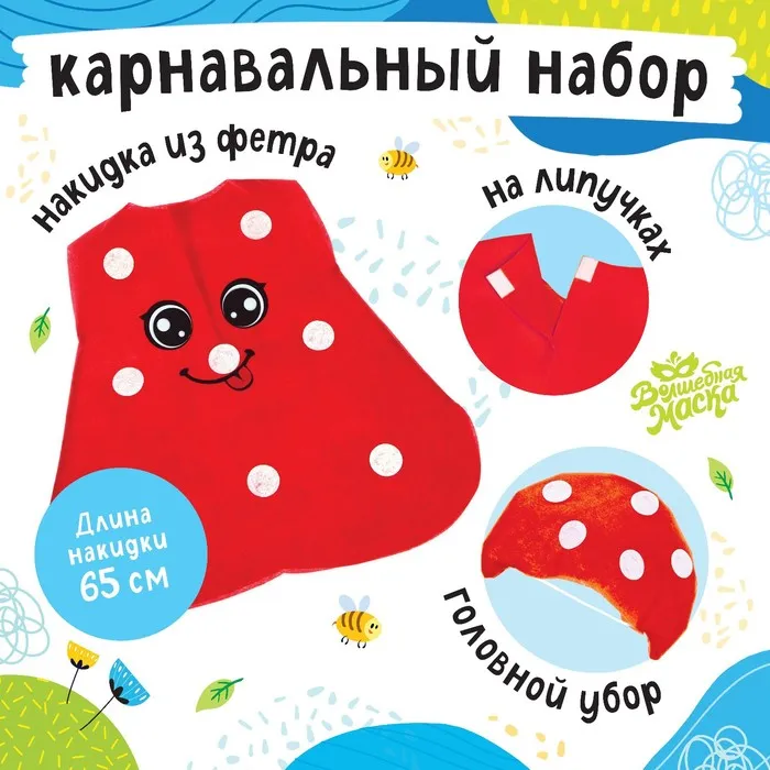 С набором «Лесной мухомор» ваша малышка станет настоящей звездой на детской вечеринке и поразит всех гостей! С ним вы составите полноценный образ, ведь в комплекте есть накидка и головной убор. Создавайте яркие эмоции и воспоминания на целый год вперёд себе и ребёнку!
