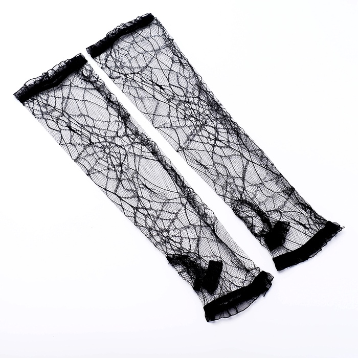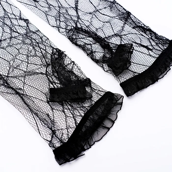 - Перчатки. Ажурные перчатки из сетки с тем же узором паутины, что и на плаще, дополнят образ. Перчатки имеют вырез для пальца, он обеспечивает удобство при ношении.