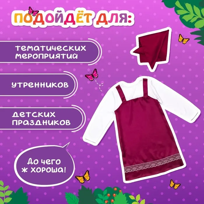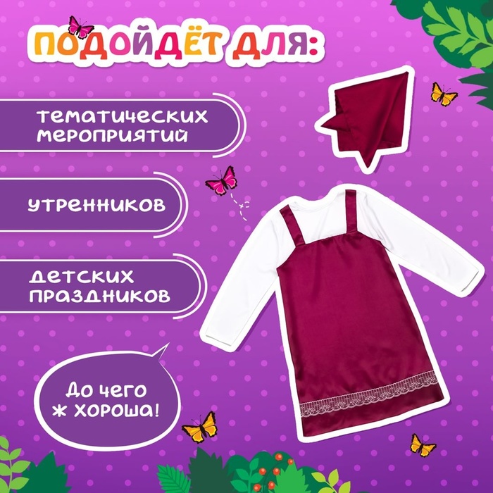 Карнавальный набор «Милая Машенька» — это отличный выбор для создания образа любимого героя. Он подойдёт для детских праздников, утренников и тематических мероприятий. Набор состоит из сарафана и косынки, он позволяет быстро и просто перевоплотиться в персонажа.