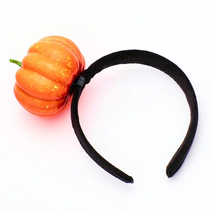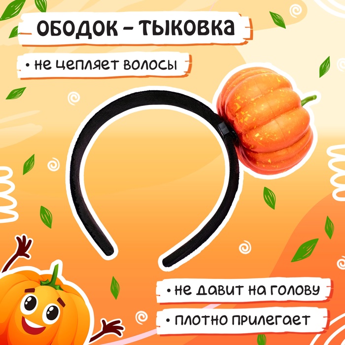 - Ободок. Стильный и мягкий ободок с объёмным изображением тыквы станет завершающим штрихом костюма. Яркий и красочный, он привлечёт внимание всех окружающих.