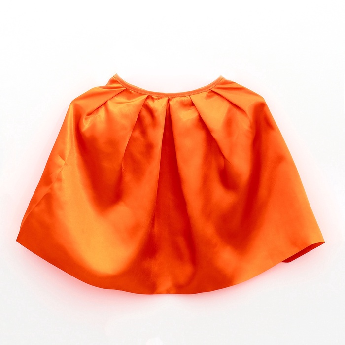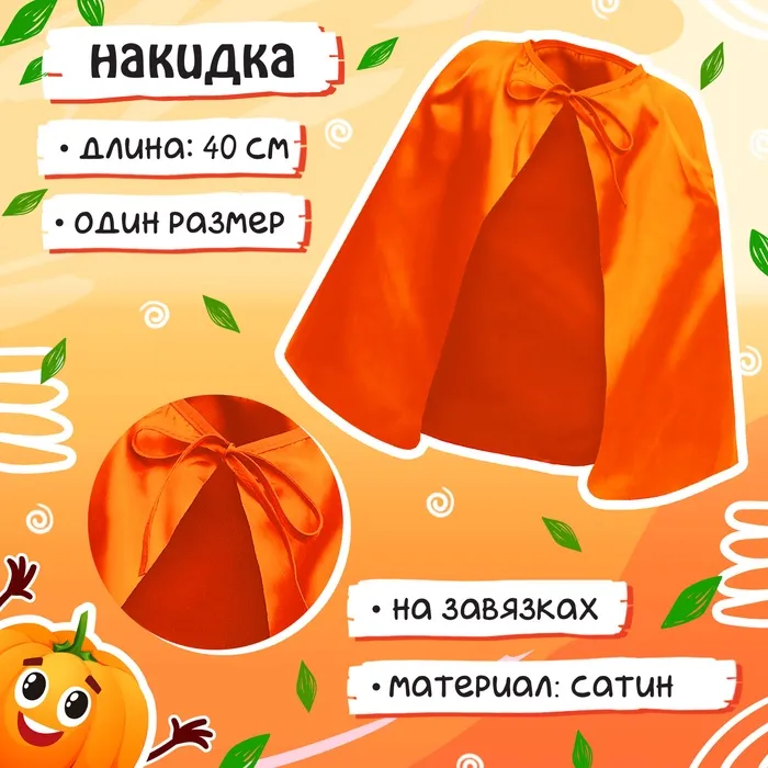- Накидка. Мягкая и приятная на ощупь накидка из полиэстера оранжевого цвета длинной 40 см. Она легко надевается и фиксируется на шее с помощью завязок. Она создаёт образ тыковки и добавляет образу юного огородника яркости и поднимает настроение.