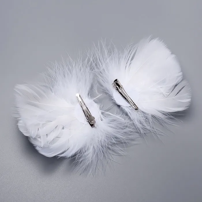 - Заколочки с белыми перьями — очаровательные аксессуары придадут образу завершённость и сделают его ещё более волшебным. Заколочки надежно фиксируются на волосах.