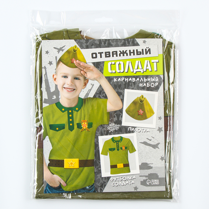 Карнавальный набор на 9 мая «Отважный солдат»: футболка рост 110 см, пилотка р. 54–56 — Характеристики