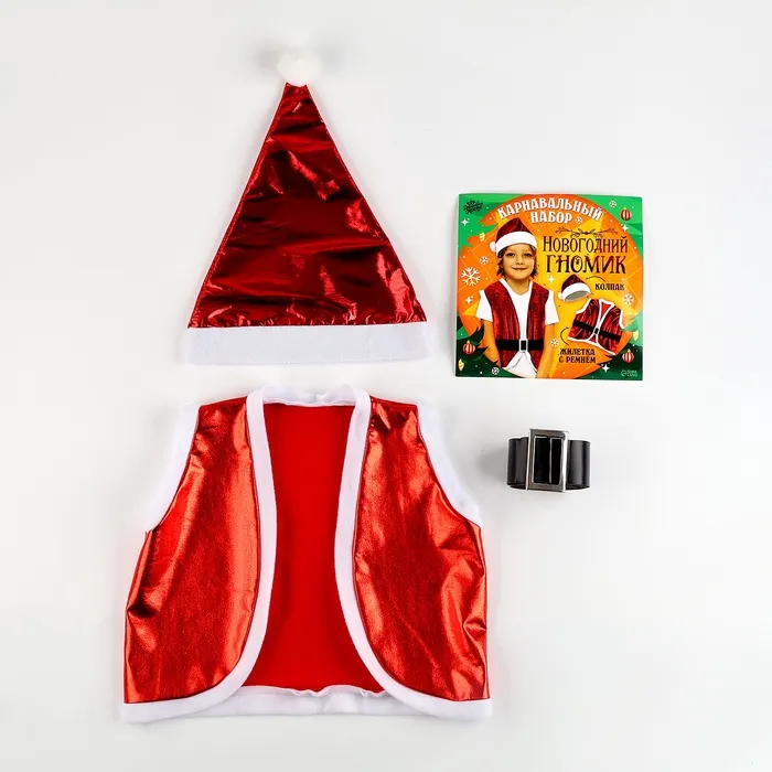 Карнавальный набор «Новогодний гномик» — всё, что нужно для создания яркого и запоминающегося образа на новогоднем празднике. Набор включает в себя необходимые элементы: жилетку, ремень и колпак.