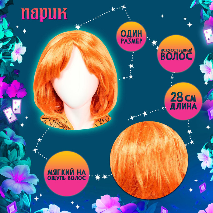 - Парик оранжевого цвета, длиной 28 см изготовлен из искусственных волос. Легко надевается и снимается, не требует особого ухода.