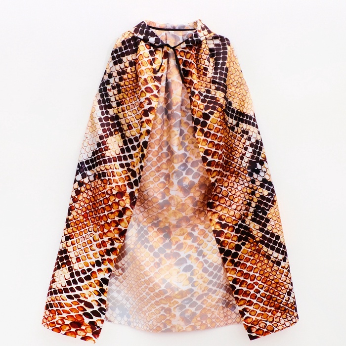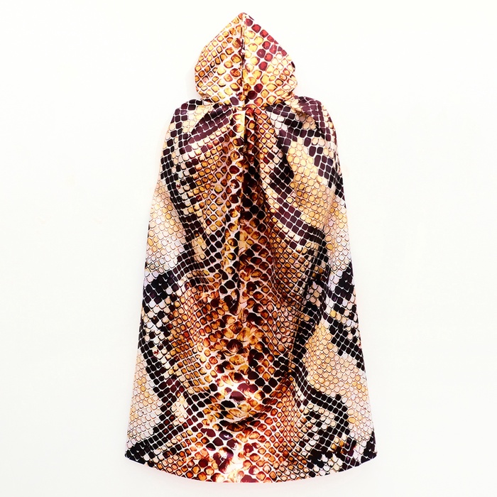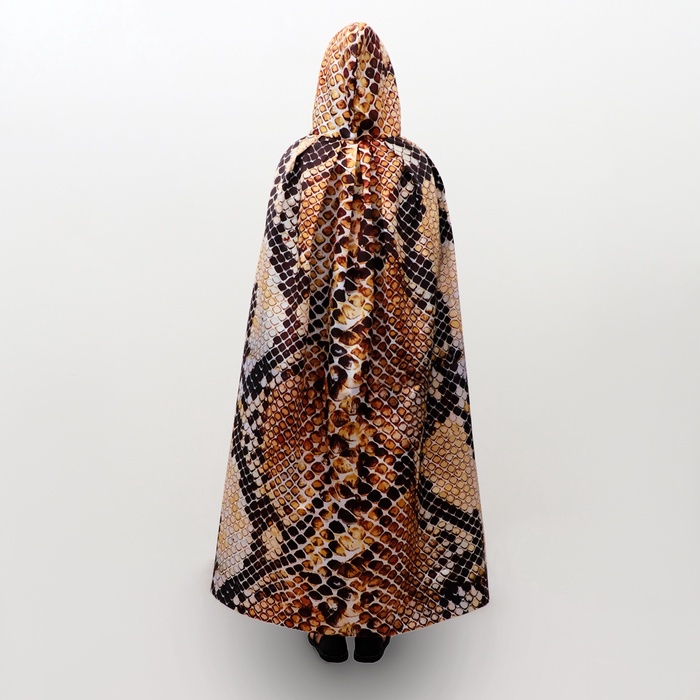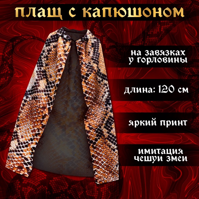 - Плащ: Плащ длинной 120 см с капюшоном создаст атмосферу таинственности. Плащ застегивается на удобные завязки и украшен стильным принтом в виде змеи.