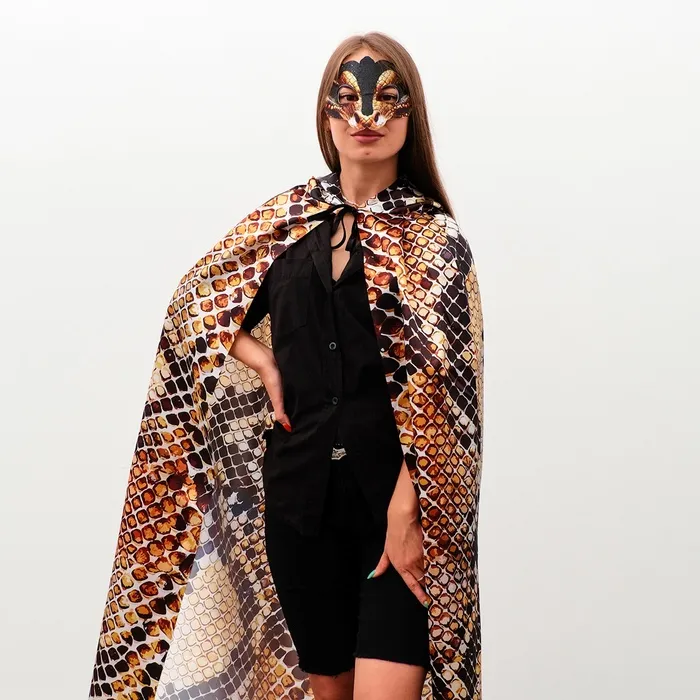 - Плащ: Плащ длинной 120 см с капюшоном создаст атмосферу таинственности. Плащ застегивается на удобные завязки и украшен стильным принтом в виде змеи.