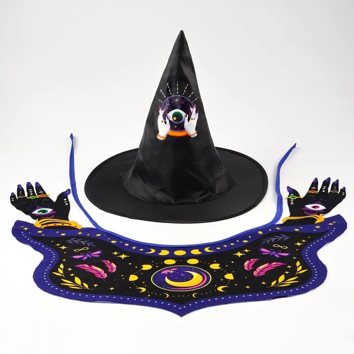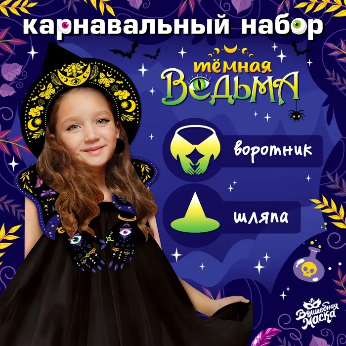 Превратитесь в загадочную и таинственную ведьму на любой праздник с карнавальным набором «Тёмная ведьма»! Этот комплект состоит из двух элегантных и мистических аксессуаров: шляпы и воротника.