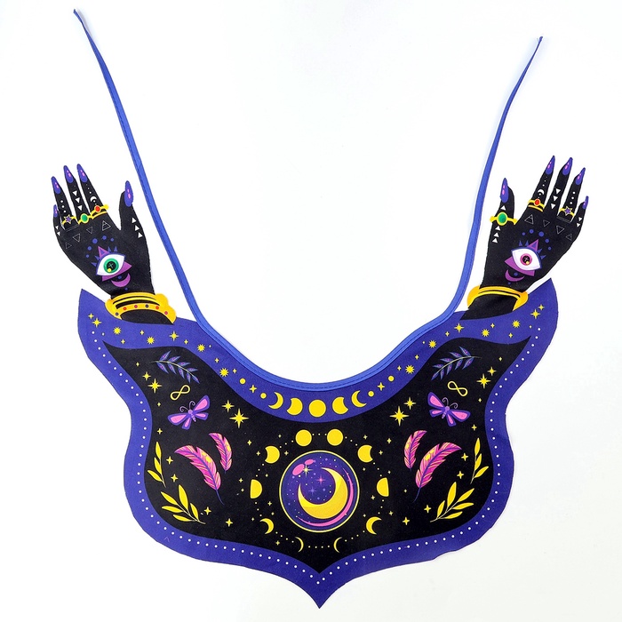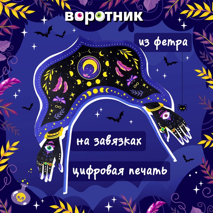 - Воротник — выполнен из мягкого фетра и декорирован завораживающими узорами. Он завязывается на шее, что позволяет регулировать его длину и плотность. Воротник добавит вашему костюму изысканности и таинственности.