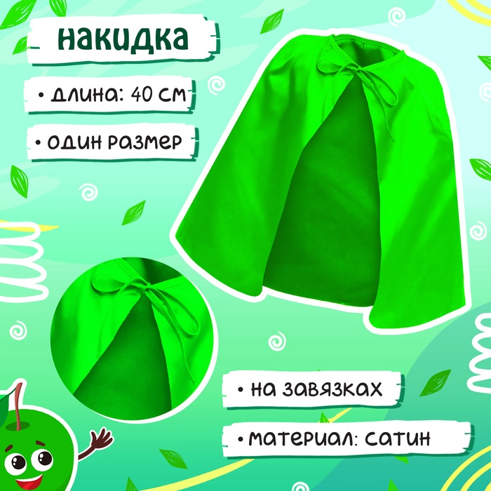 - Накидка. Накидка длинной 40 см выполнена в ярком зелёном цвете. Она свободно надевается и фиксируется на шее с помощью завязок. Накидка из полиэстера лёгкая и воздушная, что обеспечит комфорт ребёнку даже в самый разгар веселья.