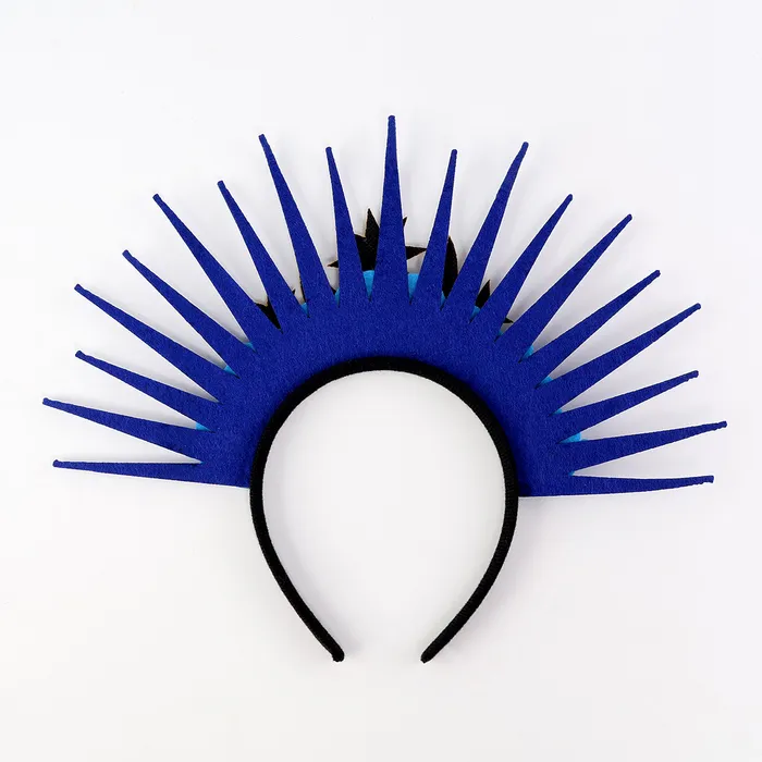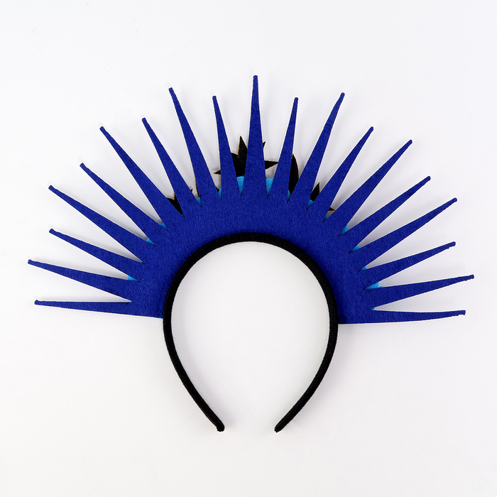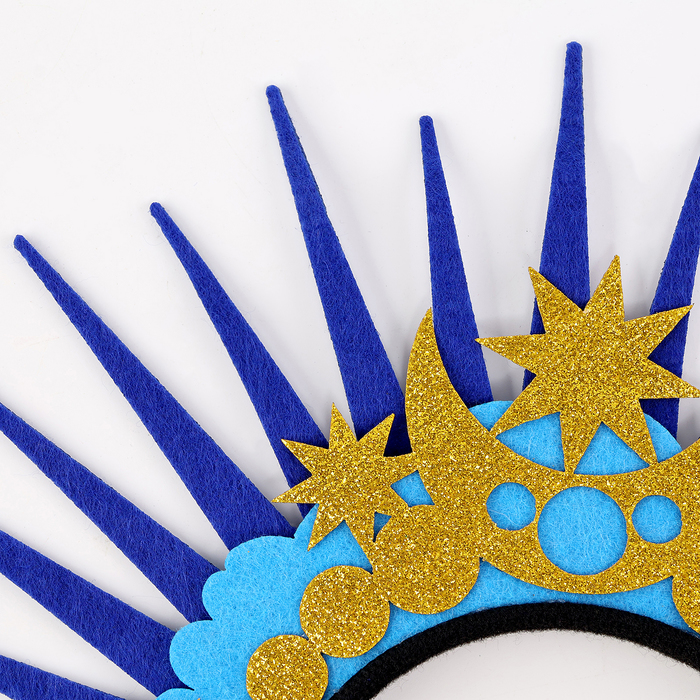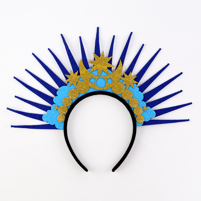 - Диадема выполнена в виде стилизованного ночного неба с лучами из синего фетра, имитирующими звездное небо