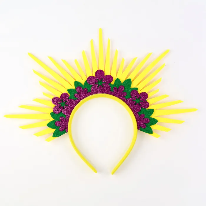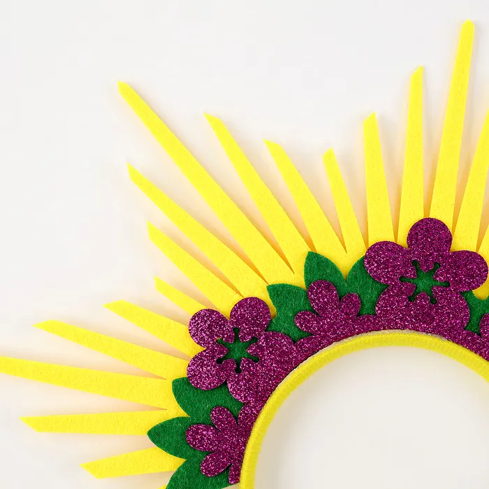 - Диадема выполнена в виде яркого солнечного нимба с лучами из желтого фетра, символизирующими солнечные лучи
