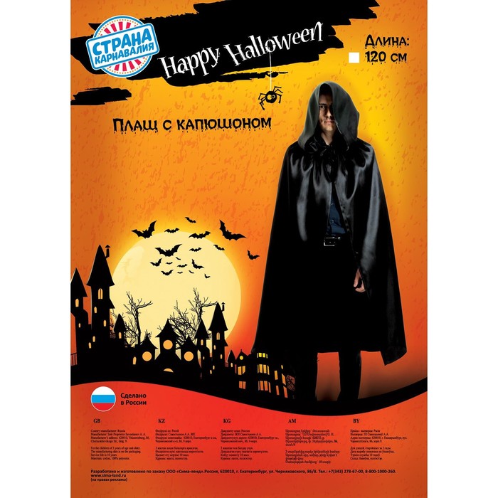 Карнавальный плащ «Хэллоуин» с капюшоном, длина 120 см, цвет чёрный — Характеристики