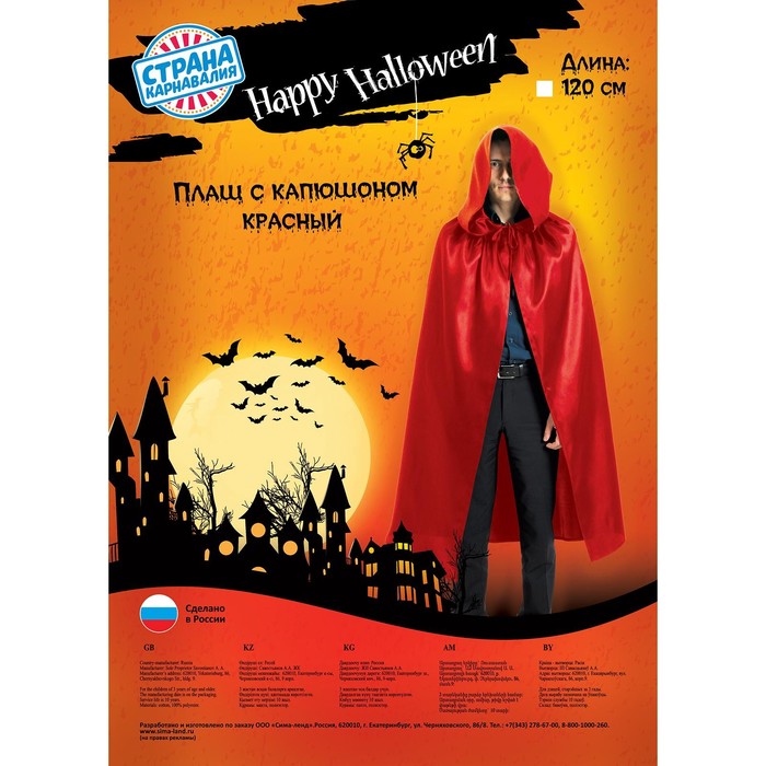 Карнавальный плащ с капюшоном, длина 120 см, красный — Характеристики