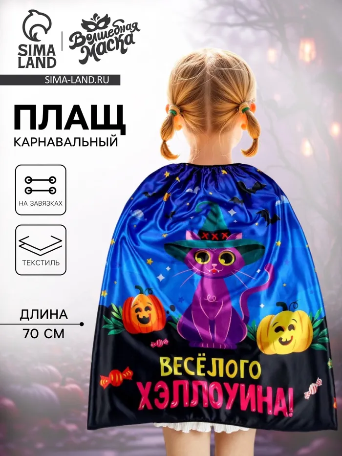 С карнавальным плащом «Весёлого Хэллоуина» вы станете настоящей звездой на тематической вечеринке и поразите всех гостей! Он эффектно дополнит ваш костюм. Создавайте яркие эмоции и воспоминания на целый год вперёд!