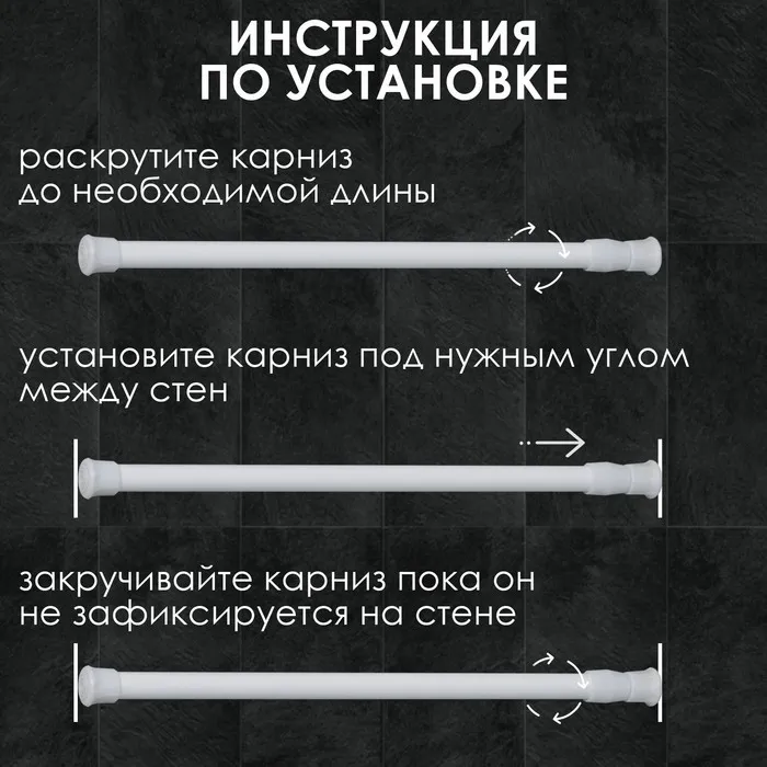 Металлический карниз работает по следующему принципу. Вы устанавливаете его одной стороной в стену и раскручиваете с другой. Так он увеличивается в размере. После того как второй край упрётся, следует сделать ещё 2–3 оборота для более надёжной фиксации. Затем просто навесьте штору с крючками и распрямите её по всей длине.