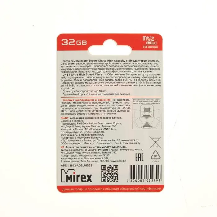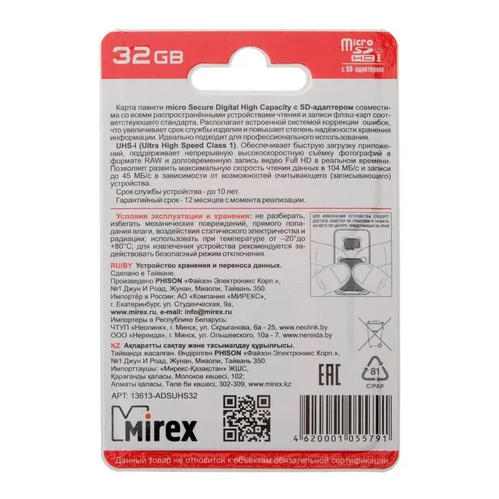 Карта памяти Mirex microSD, 32 Гб, SDHC, UHS-I, класс 10, с адаптером SD — Характеристики