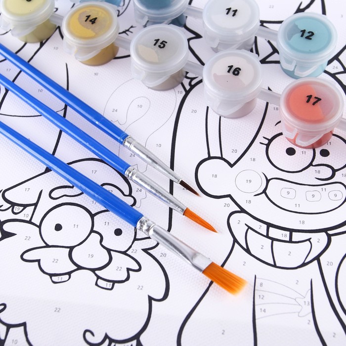 На холст нанесена схема, где пронумерован каждый сектор. Номер — цвет, написанный на баночке с краской. Нужно только раскрасить каждый сектор в соответствующий цвет.