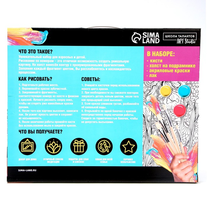 Холст разделён на множество мелких фрагментов, на каждом из которых указано число, соответствующее цвету, которым нужно закрасить данный участок. В набор входят все необходимые оттенки красок, каждый из которых пронумерован. Поначалу, когда вы только возьмёте холст в руки, будет сложно представить, что за чудесная картина получится в итоге! Но уверяем вас, результат превзойдёт все ожидания. Полотно с множеством оттенков, теней и красок будет выглядеть так, словно оно из музея.