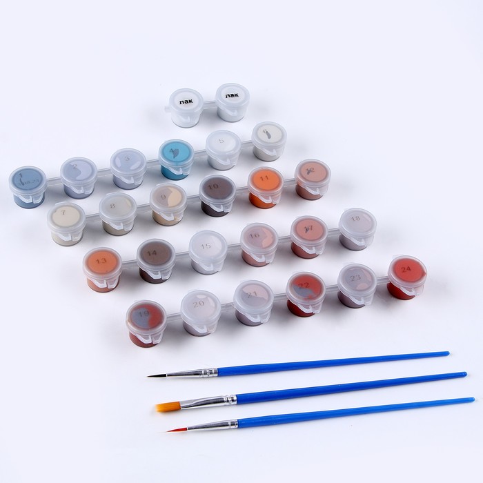 Холст разделён на множество мелких фрагментов, на каждом из которых указано число, соответствующее цвету, которым нужно закрасить данный участок. В набор входят все необходимые оттенки красок, каждый из которых пронумерован.