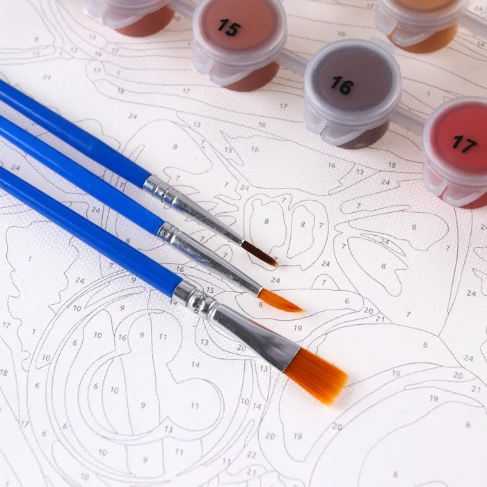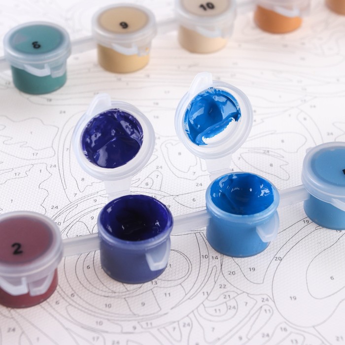 На холст нанесена схема, где пронумерован каждый сектор. Номер — цвет, написанный на баночке с краской. Нужно только раскрасить каждый сектор в соответствующий цвет.
