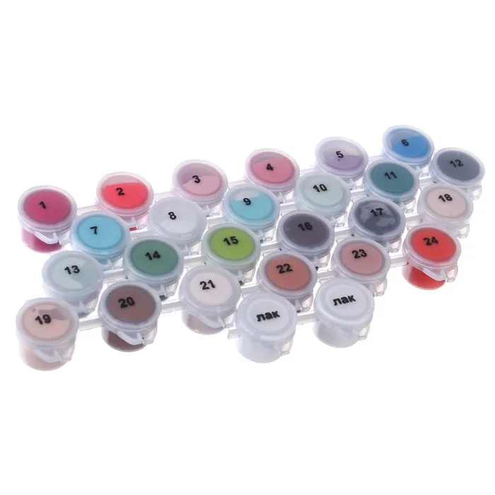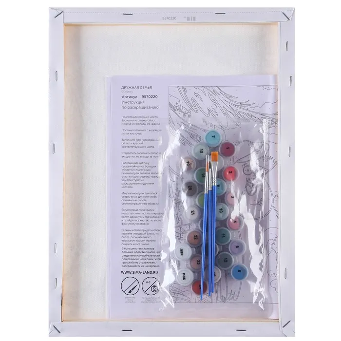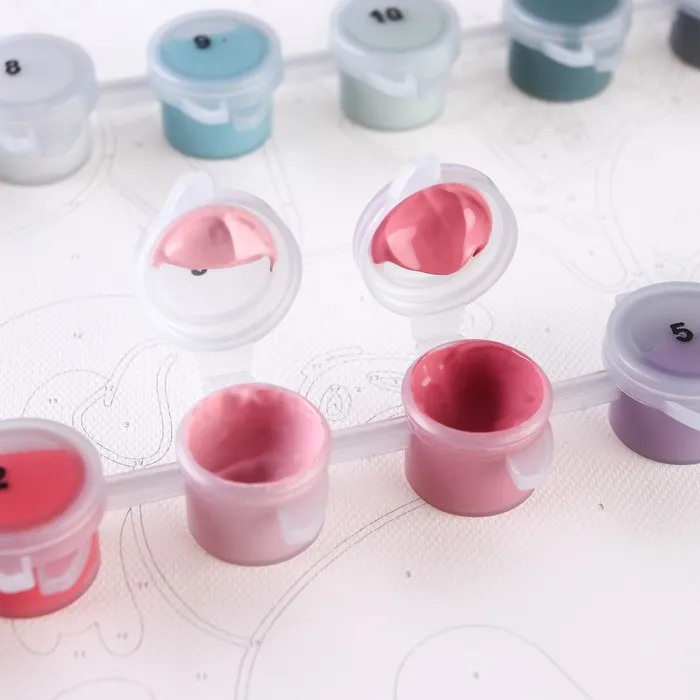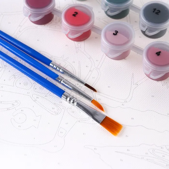 На холст нанесена схема, где пронумерован каждый сектор. Номер — цвет, написанный на баночке с краской. Нужно только раскрасить каждый сектор в соответствующий цвет.