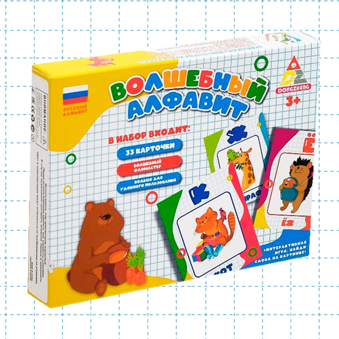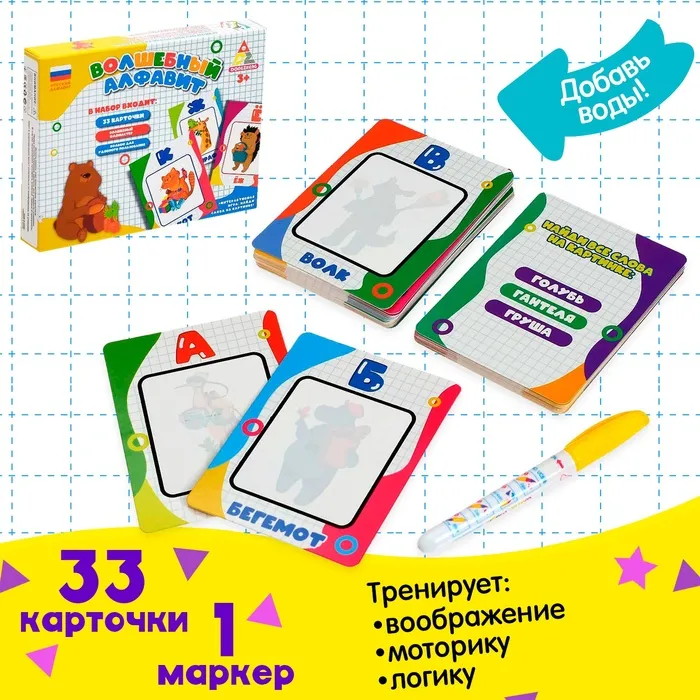 Эти творческие карточки-раскраска «Волшебный алфавит» ещё и познавательная. С ней ребёнок познакомится с буквами, вспомнит уже знакомые, прочитает слова и выполнит ряд интересных логических заданий. А волшебный маркер оживит картинки яркими красками.