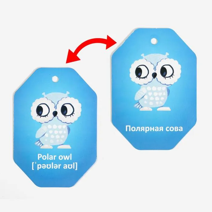 Внутри вас ждут двухсторонние карточки. На одной стороне изображён житель Северного или Южного полюсов и его название на русском, а на другой — название на английском с транскрипцией. Проденьте кольцо в карточки, и набор готов для использования. Благодаря кольцу карточки удобно хранить и они точно не потеряются.