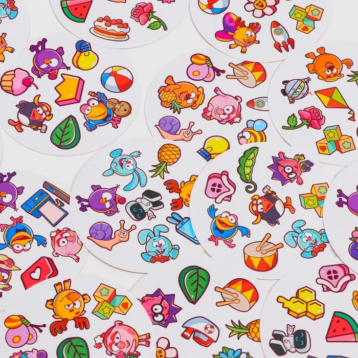 Внутри вас ждёт 55 карт с уникальным набором картинок. На каждой паре карт есть одно общее изображение. Его-то вам и нужно найти! Скорее собирайтесь всей семьёй и начинайте веселье!