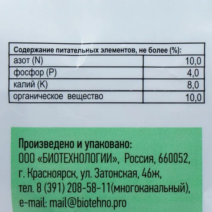 Состав: смешанное удобрение (тукосмесь) NPK 10:4:8.