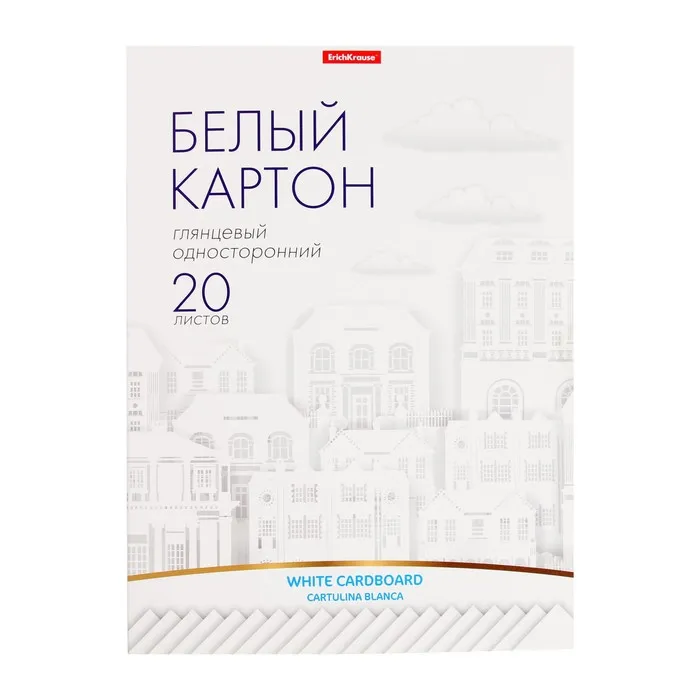 Белый картон мелованный односторонний формата А4 (203х280 мм). В папке 20 листов. Плотность наполнения — 170 г/м2. Папка из плотного картона. Упакован в термоусадочную пленку по 5 штук.