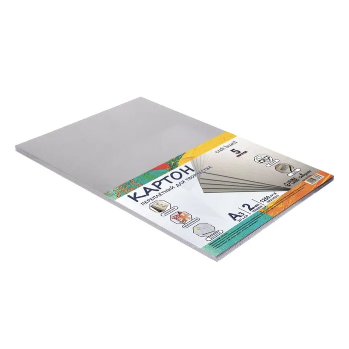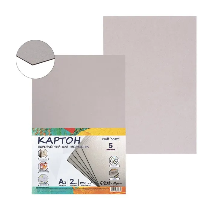 Перелетный картон – это материал премиум качества, применяемый в разнообразных видах работ. Обладает высокой механической прочностью на разрыв и излом, не гибкий, не расслаивается, хорошо воспринимает клей, краску, скетч-маркеры. Переплетный картон формата А3, толщиной 2 мм и плотностью 1250 г/м2, поставляется в наборе по 5 штук. Используется в хобби и творчестве, полиграфии, скрапбукинге, моделировании, декупаже, в рисовании, в изготовлении обложек для полиграфической продукции, паспарту, творческих поделок, открыток, грунтованного холста, подшивке документов. Переплетный картон можно клеить, резать, сшивать, сверлить и т.д. Это практически универсальный материал, имеющий множество вариантов использования в руках мастера.