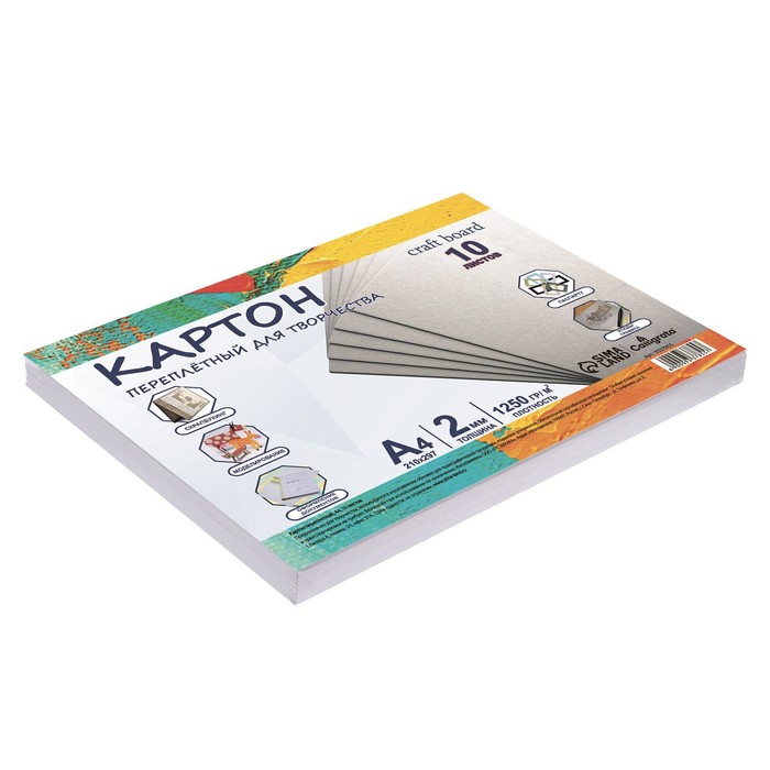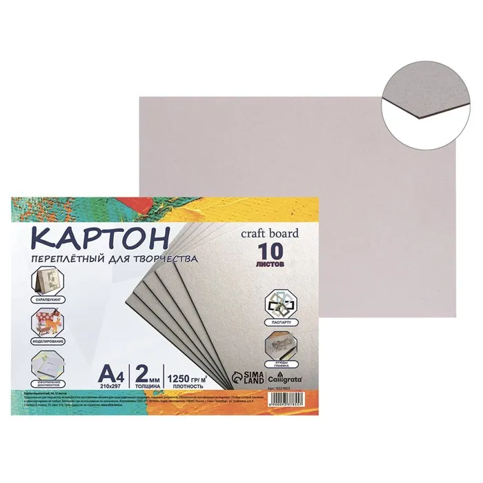 Переплетный картон – это материал премиум качества, применяемый в разнообразных видах работ. Обладает высокой механической прочностью на разрыв и излом, не гибкий, не расслаивается, хорошо воспринимает клей, краску, скетч-маркеры. Переплетный картон формата А4, толщиной 2 мм и плотностью 1250 г/м2, поставляется в наборе по 10 штук. Используется в хобби и творчестве, полиграфии, скрапбукинге, моделировании, декупаже, в рисовании, в изготовлении обложек для полиграфической продукции, паспарту, творческих поделок, открыток, грунтованного холста, подшивке документов. Переплетный картон можно клеить, резать, сшивать, сверлить и т.д. Это практически универсальный материал, имеющий множество вариантов использования в руках мастера.