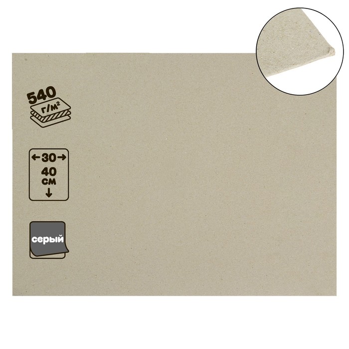 Картон переплётный (обложечный) 0.9 мм, 30 х 40 см, 540 г/м², серый — Характеристики