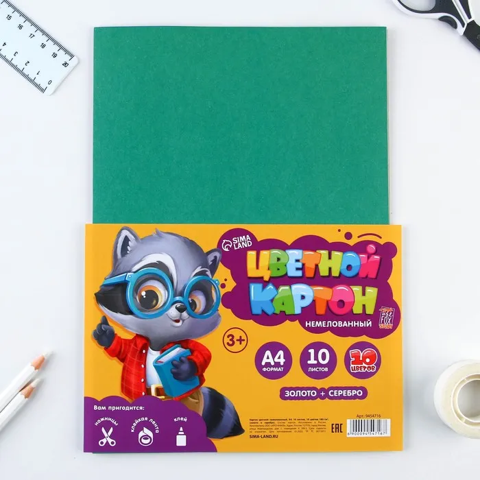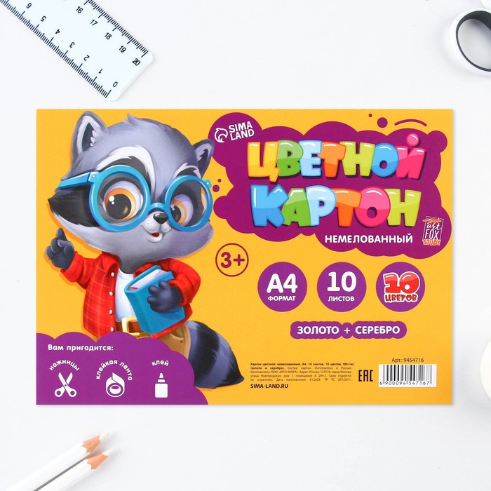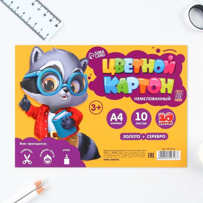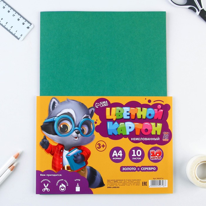 Картон цветной А4, 10 листов 10 цветов немелованный односторонний «Енотик» 180 г золото+серебро в плёнке — Характеристики