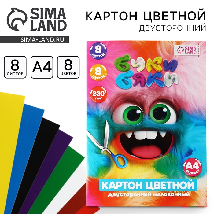 Картон цветной двусторонний А4 8 листов 8 цветов мелованный 230 г/м² «БукиБяки»