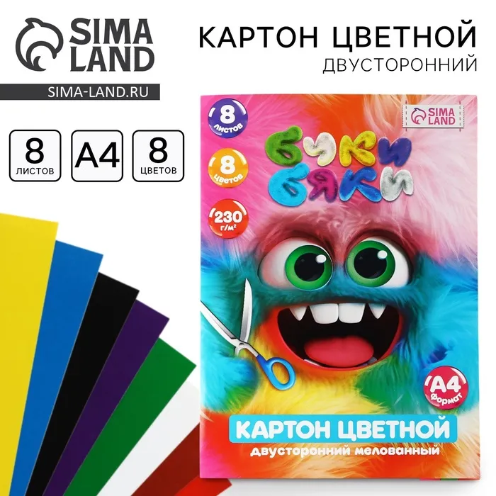 Картон цветной двусторонний А4 8 листов 8 цветов мелованный 230 г/м² «БукиБяки» — Характеристики