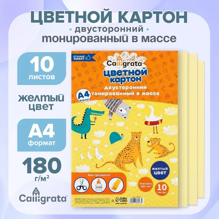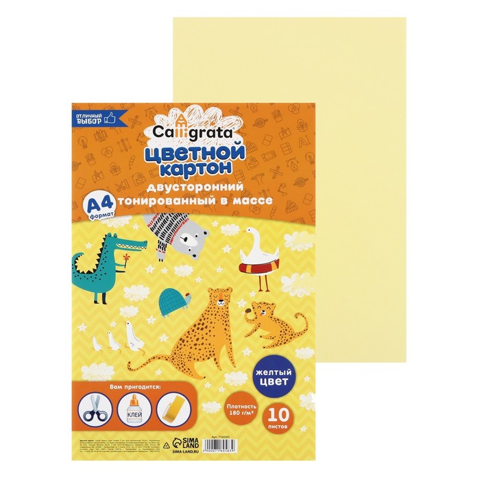 Картон цветной двусторонний А4, тонированный в массе, 10 листов, 180 г/м2, жёлтый — Характеристики