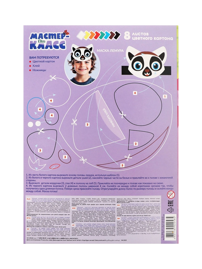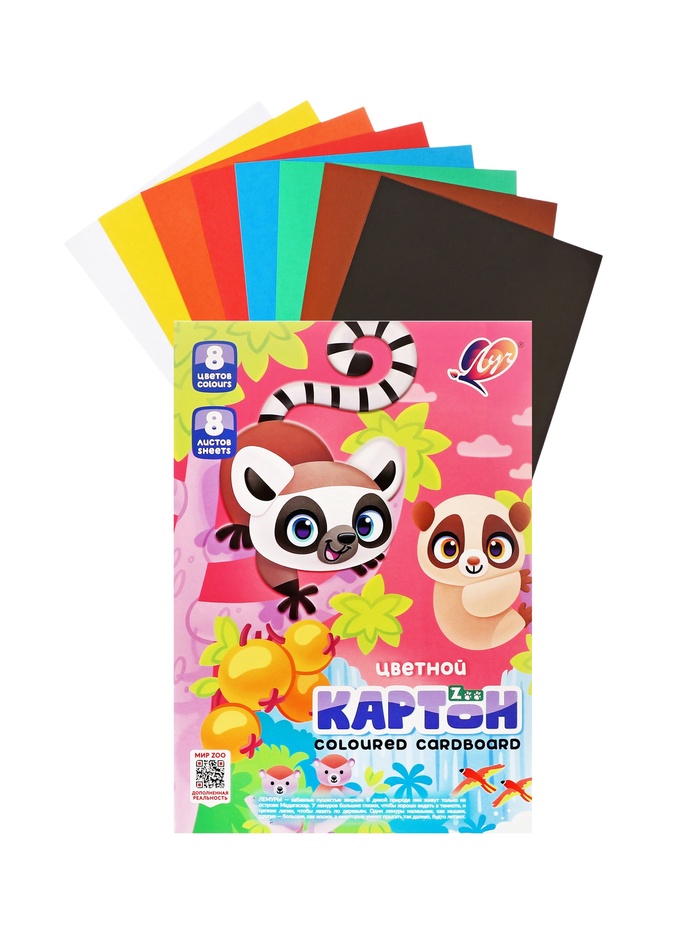 Картон цветный, А4 8 листов 8 цветов, немелованный, односторонний 220 г/м² , Луч, Zoo.Лемуры — Характеристики