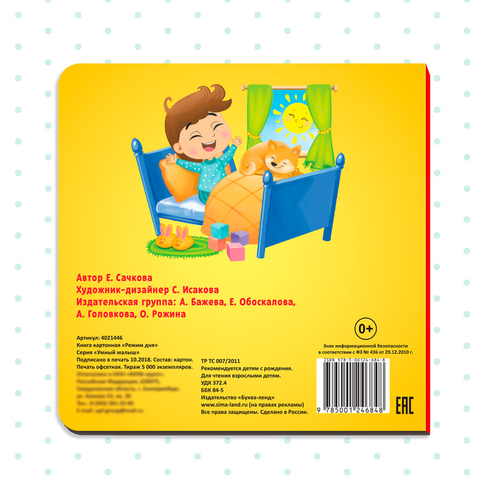 Книга-помощник «Режим дня» в квадратном формате станет первым шагом малыша в освоении распорядка дня. Автор создала яркие иллюстрации с весёлыми стихами, которые помогут ребёнку понять, что утро — это время для зарядки и чистки зубов, день — для прогулок, а вечер — для отдыха. Твёрдый переплёт и 10 страниц из плотного картона делают книгу идеальной для детей с первых месяцев жизни.