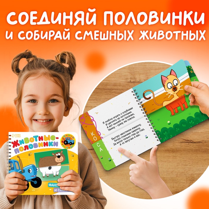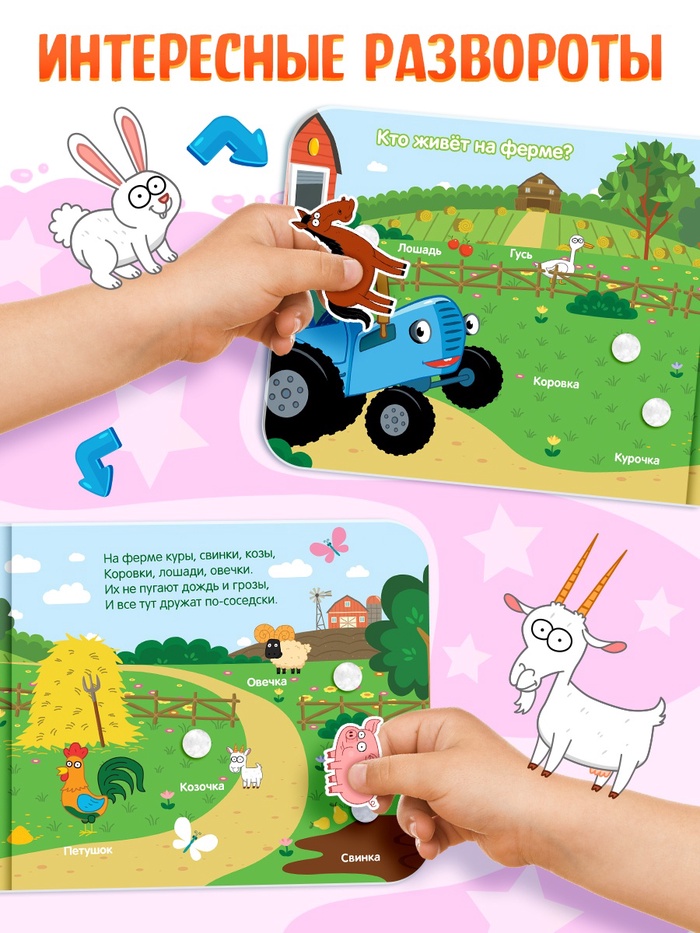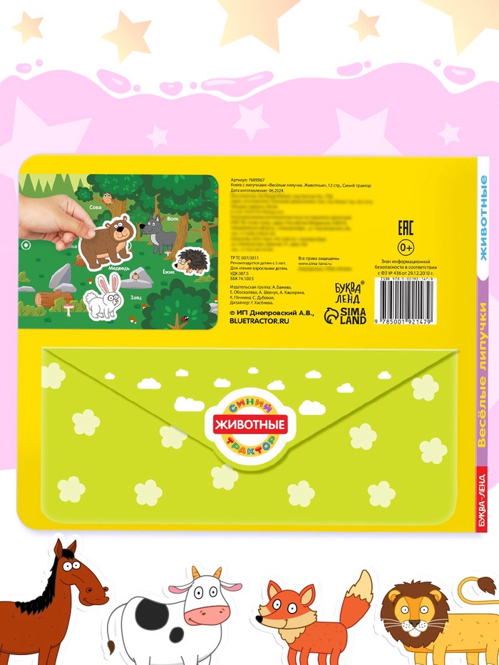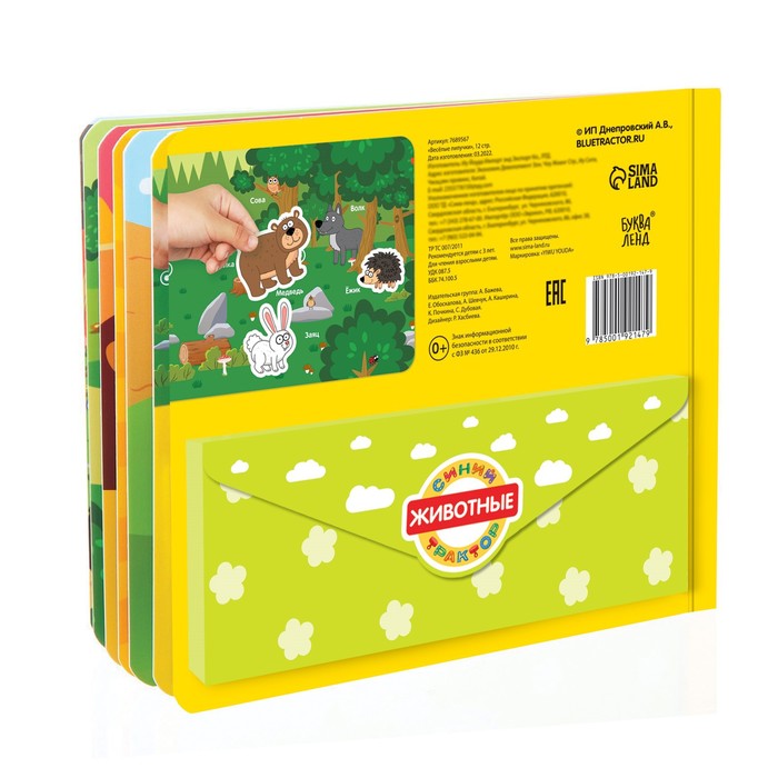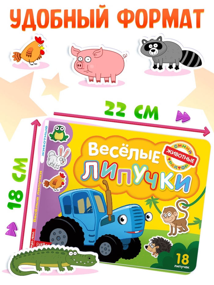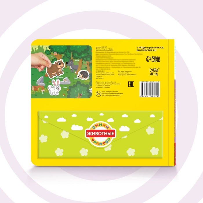 Книга предлагает малышу выполнить интересные задания, используя яркие липучки с изображениями животных. Ребёнок научится различать животных, развивая мелкую моторику и логическое мышление. Любимые герои мультфильма «Синий трактор» делают процесс обучения увлекательным и запоминающимся.