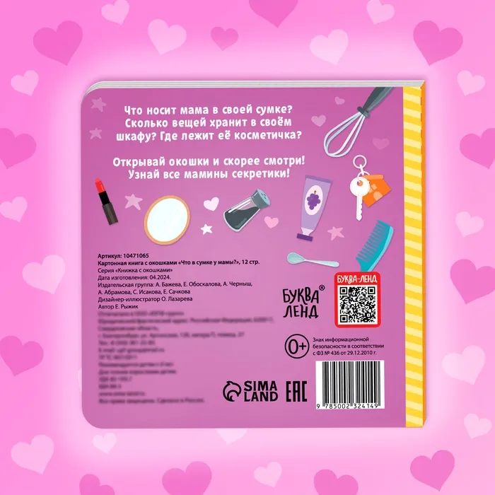 Картонная книга с окошками «Что в сумке у мамы?», 12 стр. — Характеристики